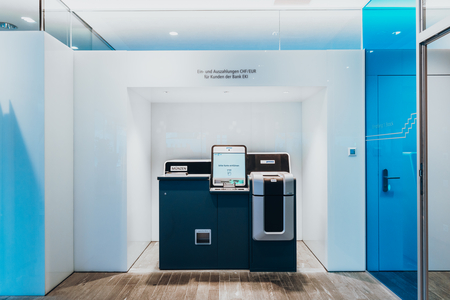 Am neuen Ein- und Auszahlungsautomat können Sie bequem während 24 Stunden und 365 Tage im Jahr Ihre Tageseinnahmen in CHF und Euro einzahlen oder Geld beziehen. Auch in der Kundenzone steht Ihnen ein Automat für Ein- sowie Auszahlungen während der Öffnungszeiten zur Verfügung. Die Beträge werden automatisch Ihrem Konto gutgeschrieben. Sie erhalten umgehend eine Quittung mit einer detaillierten Aufstellung der eingezahlten Noten in CHF und Euro. Der Saldo wird nicht angezeigt. Die Einzahlungen am Automaten erfolgen mit einer Debitkarte.