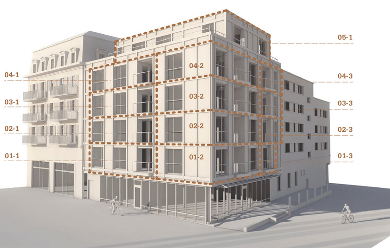 Auf fünf Stockwerken stehen ein Studio, elf 2.5-Zimmer-Wohnungen und eine Attika-Wohnung zur Verfügung. Die Wohnfläche variiert je nach Wohnung zwischen 33.85 und 128.80 m2. Die Küchen sind offen in die Wohnbereiche integriert. Alle Wohnungen verfügen über mindestens einen Balkon. Für den Zugang zu den Wohnungen steht nebst dem grosszügigen Treppenhaus ein rollstuhlgängiger Lift über alle Geschosse zur Verfügung (Kapazität 8 Personen).