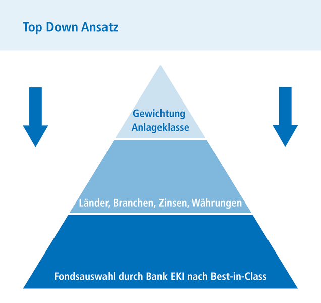 Bei der Fondsauswahl stützen wir uns immer auf Analysedaten, die von unabhängigen Finanzinformations- und Analyseunternehmen erhoben werden. Wir setzen auf aktiv verwaltete Fonds weil es Fondsmanager gibt, welche in der Lage sind, aufgrund ihres Wissens und ihrer Erfahrung, den Markt zu schlagen. Die Manager werden nach ihrer Eignung im jeweiligen Marktumfeld ausgewählt. Es können aber auch passiv verwaltete Produkte eingesetzt werden. Da die Bank EKI keine eigenen Fonds führt, ist eine unabhängige Selektion gewährleistet. Durch die Verteilung des Kapitals auf verschiedene Märkte, Titel, Branchen, Regionen und Währungen, erreichen wir eine optimale Risikostruktur. Unser Konzept erlaubt hohe Flexibilität, was zum Erreichen der Anlageziele beiträgt. Unsere Experten verfolgen für Sie die Entwicklung an den Weltmärkten und investieren da, wo es sich für Sie lohnt.